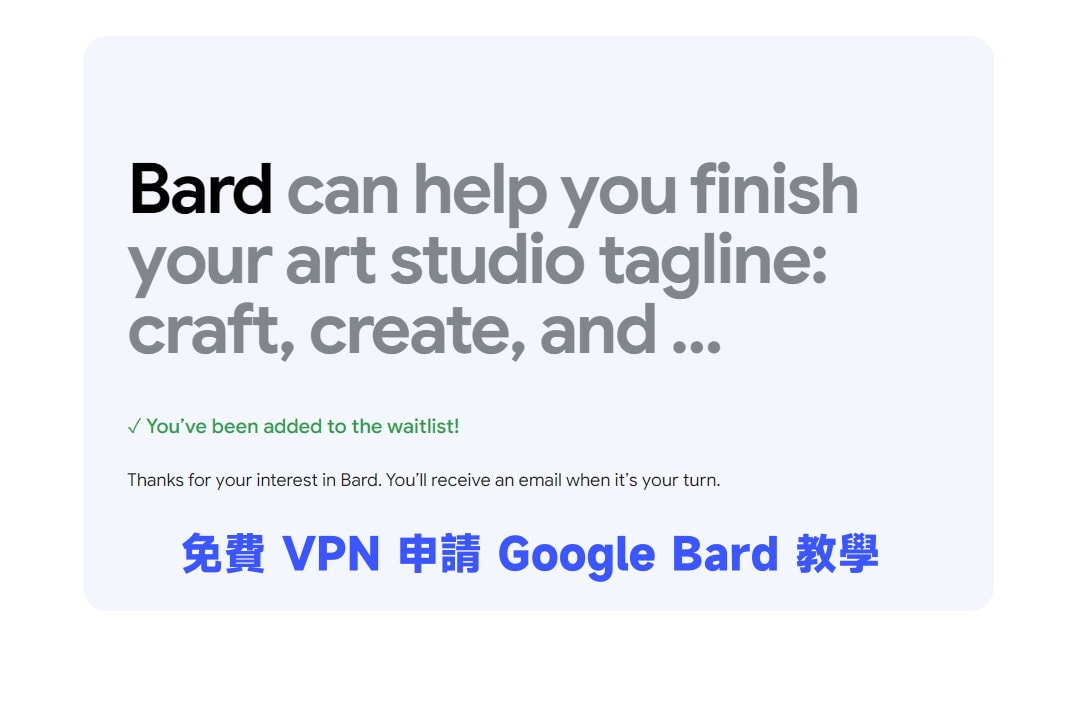 看到這頁面時就表示我們已經成功申請 Google Bard,接下來就是等他們通知。(小提醒:申請到 Google Bard試用名額後,需要一直 VPN 在美國或英國,才能一直跟 Google Bard 聊天對話。)